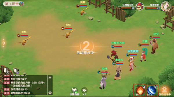 在自动战斗的过程中,可在任意时间点切换下次的作战指令,点击左边技能图标切换主角的下次指令,右边技能图标为宠物的作战指令。可切换技能或者切换为普通攻击或防御。